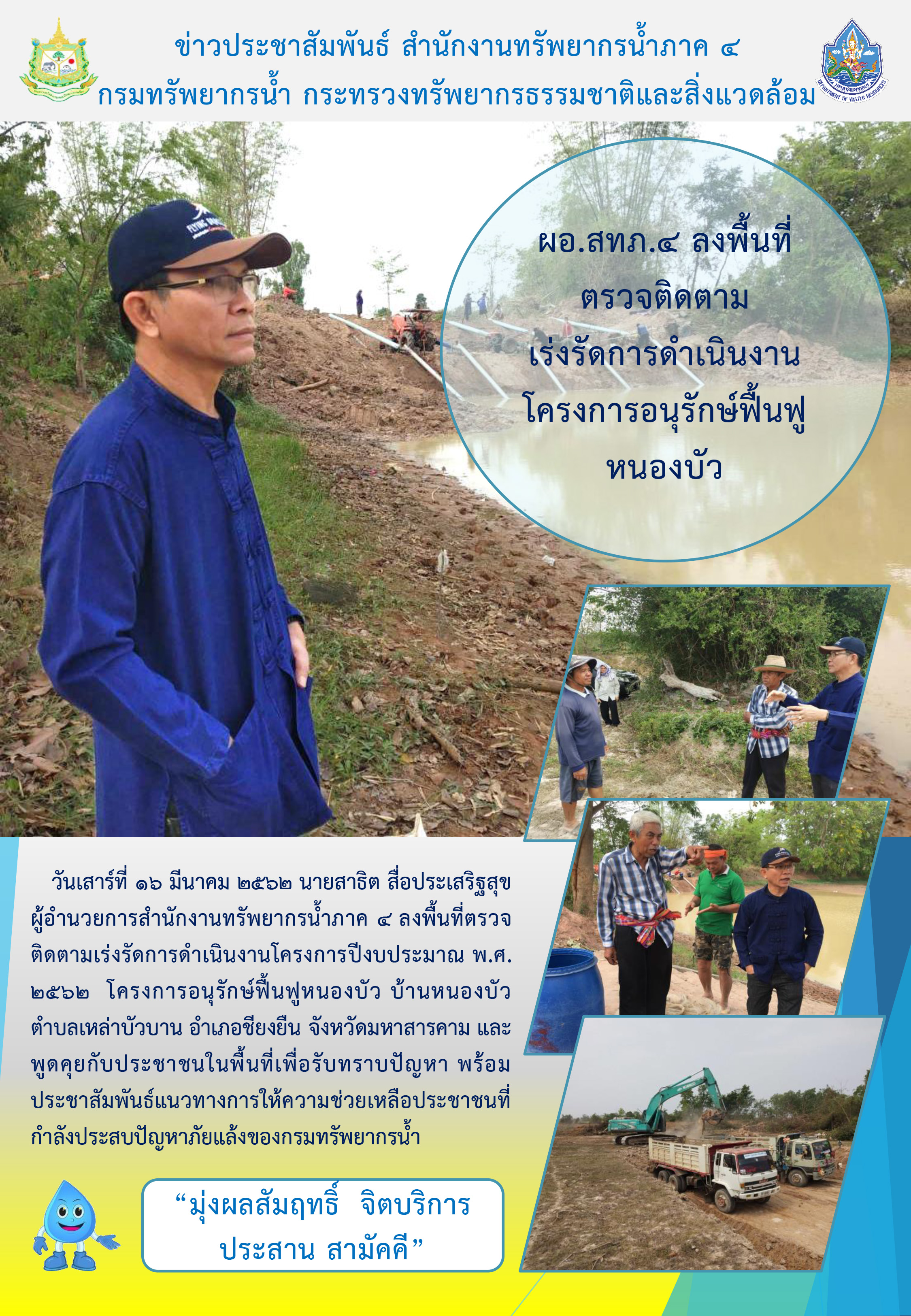 วันเสาร์ที่ 16 มีนาคม 2562 นายสาธิต สื่อประเสริฐสุข ผู้อำนวยการสำนักงานทรัพยากรน้ำภาค 4 ลงพื้นที่ตรวจติดตามเร่งรัดการดำเนินงานโครงการปีงบประมาณ พ.ศ. 2562 โครงการอนุรักษ์ฟื้นฟูหนองบัว บ้านหนองบัว ตำบลเหล่าบัวบาน อำเภอชียงยืน จังหวัดมหาสารคาม และพูดคุยกับประชาชนในพื้นที่เพื่อรับทราบปัญหา พร้อมประชาสัมพันธ์แนวทางการให้ความช่วยเหลือประชาชนที่กำลังประสบปัญหาภัยแล้งของกรมทรัพยากรน้ำ
