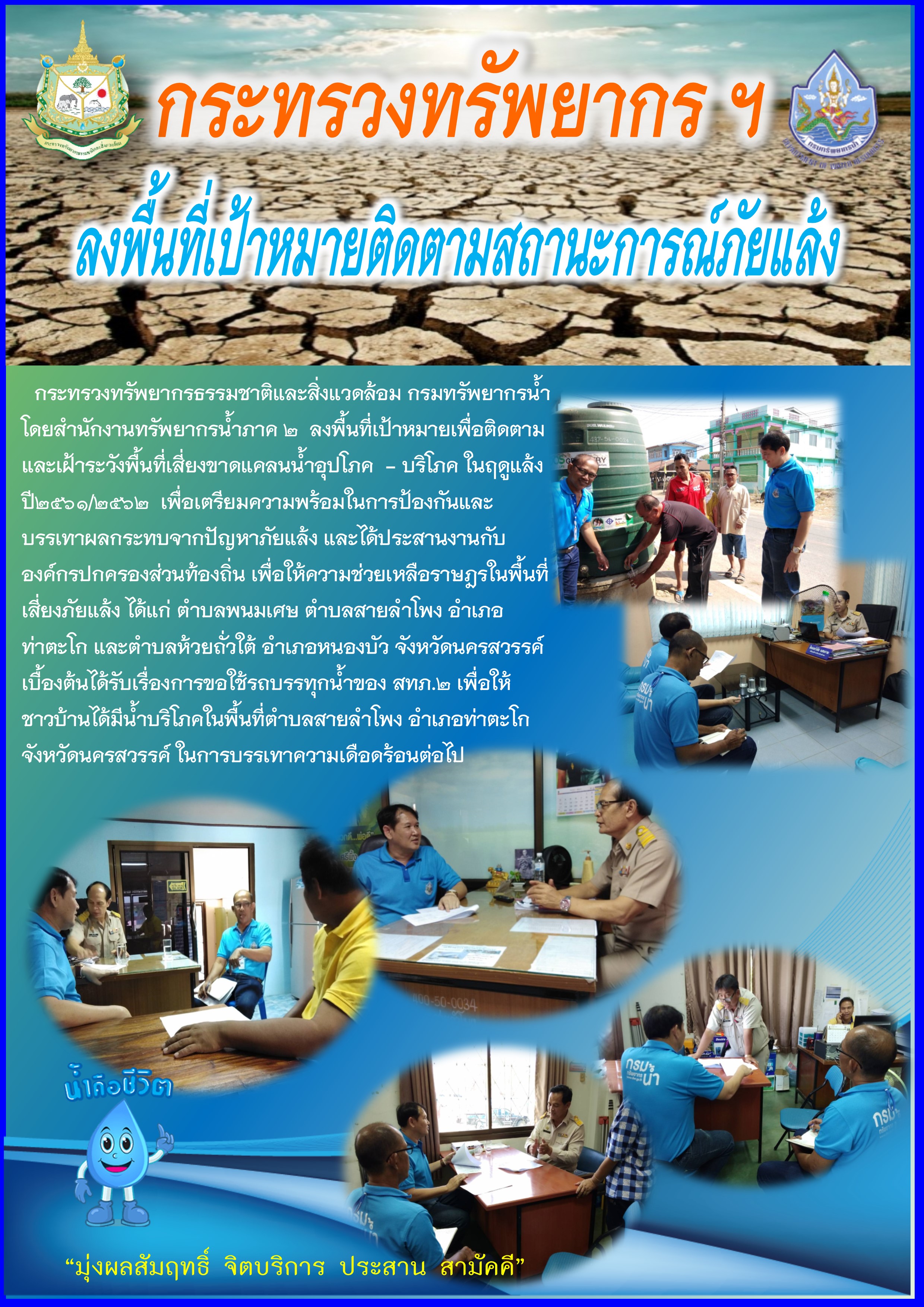 กระทรวงทรัพยากรธรรมชาติและสิ่งแวดล้อม กรมทรัพยากรน้ำ โดยสำนักงานทรัพยากรน้ำภาค 2 ลงพื้นที่เป้าหมายเพื่อติดตามและเฝ้าระวังพื้นที่เสี่ยงขาดแคลนน้ำอุปโภค - บริโภค ในฤดูแล้ง ปี2561/2562 เพื่อเตรียมความพร้อมในการป้องกันและบรรเทาผลกระทบจากปัญหาภัยแล้งและได้ประสานงานกับองค์กรปกครองส่วนท้องถิ่น เพื่อให้ความช่วยเหลือราษฎรในพื้นที่เสี่ยงภัยแล้ง ได้แก่ ตำบลพนมเศษ ตำบลสายลำโพง อำเภอท่าตะโก และตำบลห้วยถั่วใต้ อำเภอหนองบัว จังหวัดนครสวรรค์ เบื้องต้นได้รับเรื่องการขอใช้รถบรรทุกน้ำของ สทภ.2 เพื่อให้ชาวบ้านได้มีน้ำบริโภคในพื้นที่ตำบลสายลำโพง อำเภอท่าตะโก จังหวัดนครสวรรค์ ในการบรรเทาความเดือดร้อนต่อไป