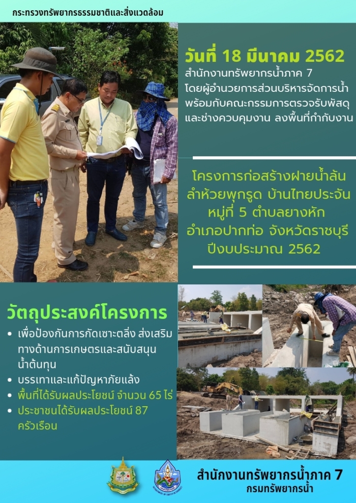 วันที่ 18 มีนาคม 2562 สำนักงานทรัพยากรน้ำภาค 7 โดยผู้อำนวยการส่วนบริหารจัดการน้ำ พร้อมกับคณะกรรมการตรวจรับพัสดุและช่างควบคุมงาน ลงพื้นที่กำกับงานโครงการก่อสร้างฝายน้ำล้นลำห้วยพุกรูด บ้านไทยประจัน หมู่ที่ 5 ตำบลยางหัก อำเภอปากท่อ จังหวัดราชบุรี ปีงบประมาณ 2562 วัตถุประสงค์โครงการเพื่อป้องกันการกัดเซาะตลิ่ง ส่งเสริมทางด้านการเกษตรและสนับสนุนน้ำต้นทุน บรรเทาและแก้ปัญหาภัยแล้ง พื้นที่ได้รับผลประโยชน์ จำนวน 65 ไร่ประชาชนได้รับผลประโยชน์ 87 ครัวเรือน (ภาพและข้อมูลข่าวจาก สพฟ.)