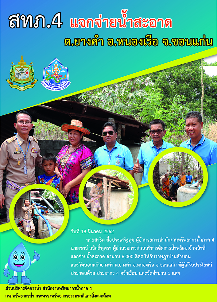 ผู้อำนวยการสำนักงานทรัพยากรน้ำภาค 4 นายเชาว์ สวัสดิ์พุทรา ผู้อำนวยการส่วนบริหารจัดการน้ำพร้อมเจ้าหน้าที่ แจกจ่ายน้ำสะอาด จำนวน 6,000 ลิตร ให้กับราษฎรบ้านคำบอนและวัดบอนแก้วยางคำ ต.ยางคำ อ.หนองเรือ จ.ขอนแก่น มีผู้ได้รับประโยชน์ ประกอบด้วย ประชากร 4 ครัวเรือน และวัดจำนวน 1 แห่ง