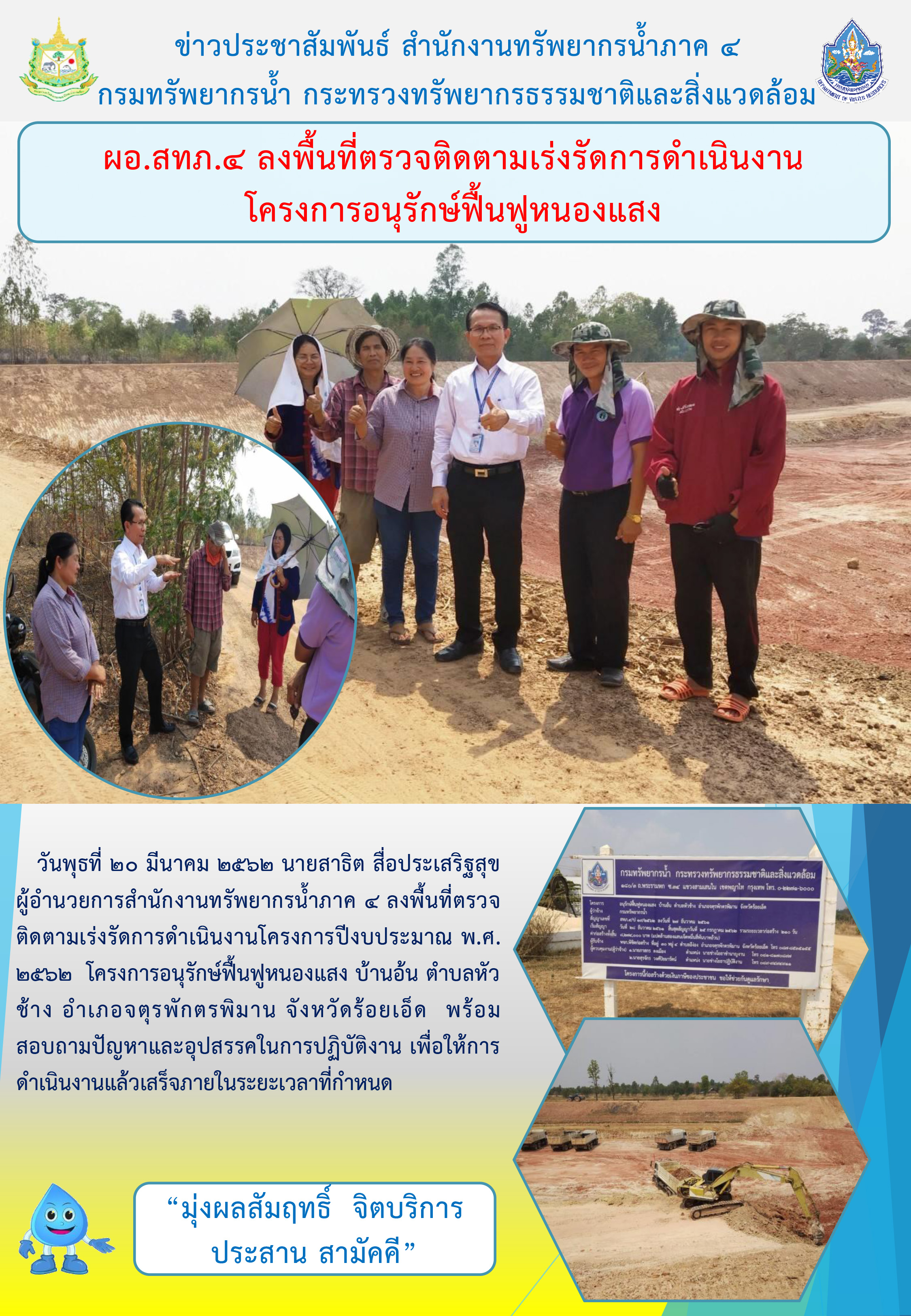 วันพุธที่ 20 มีนาคม 2562 นายสาธิต สื่อประเสริฐสุข ผู้อำนวยการสำนักงานทรัพยากรน้ำภาค 4 ลงพื้นที่ตรวจติดตามเร่งรัดการดำเนินงานโครงการปีงบประมาณ พ.ศ. 2562 โครงการอนุรักษ์ฟื้นฟูหนองแสง บ้านอ้น ตำบลหัวช้าง อำเภอจตุรพักตรพิมาน จังหวัดร้อยเอ็ด พร้อมสอบถามปัญหาและอุปสรรคในการปฏิบัติงาน เพื่อให้การดำเนินงานแล้วเสร็จภายในระยะเวลาที่กำหนด