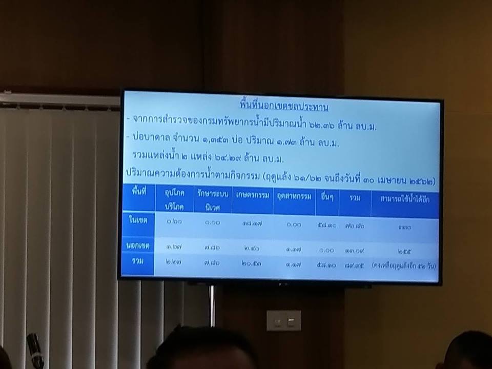 ในการนี้ได้รายงานความพร้อมของเครื่องมือเครื่องจักรและผลการช่วยเหลือบรรเทาภัยแล้งให้ที่ประชุมทราบ โดยในช่วงปลายฤดูฝนได้สูบน้ำเข้าแหล่งน้ำธรรมชาติและสระเก็บน้ำดิบสำหรับผลิตประปาในพื้นที่ตำบลดงกระทงยาม อำเภอศรีมหาโพธิ และตำบลท่างาม อำเภอเมืองปราจีนบุรี จังหวัดปราจีนบุรี ตั้งแต่ 9 พฤศจิกายน 2561 ถึงวันที่ 13 กุมภาพันธ์ 2562 รวมปริมาณการสูบเตรียมแล้งแล้ว 2.638 ล้านลูกบาศก์เมตร