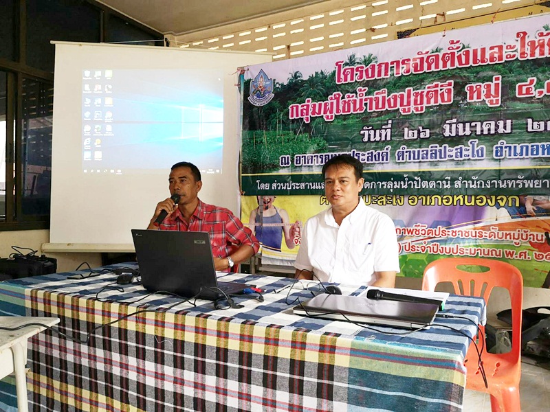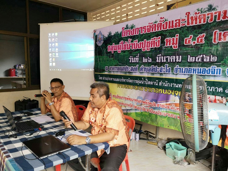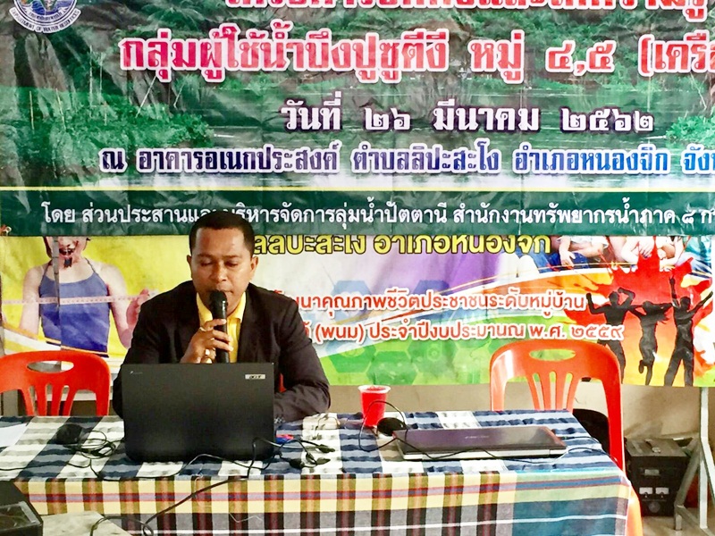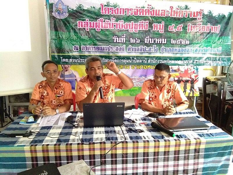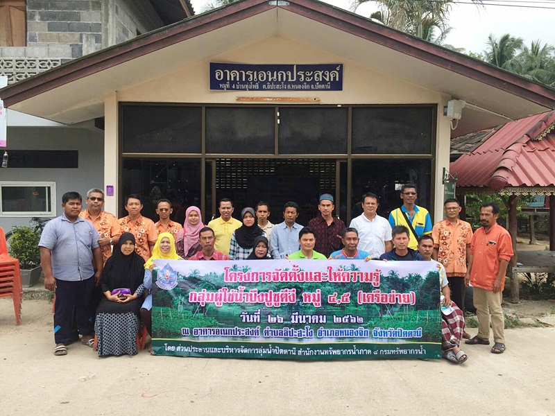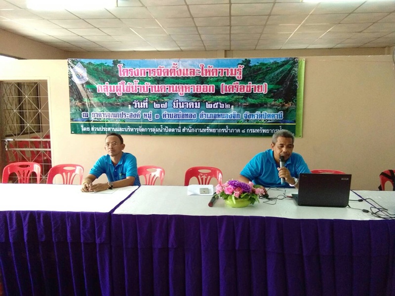นายไกรสร เพ็งสกุล ผู้อำนวยการสำนักงานทรัพยากรน้ำภาค 8 มอบหมายให้ส่วนประสานและบริหารจัดการลุ่มน้ำปัตตานี ดำเนินการจัดกิจกรรมโครงการจัดตั้งและให้ความรู้กลุ่มผู้ใช้น้ำ (เครือข่าย) จำนวน 2 กลุ่ม ดังนี้