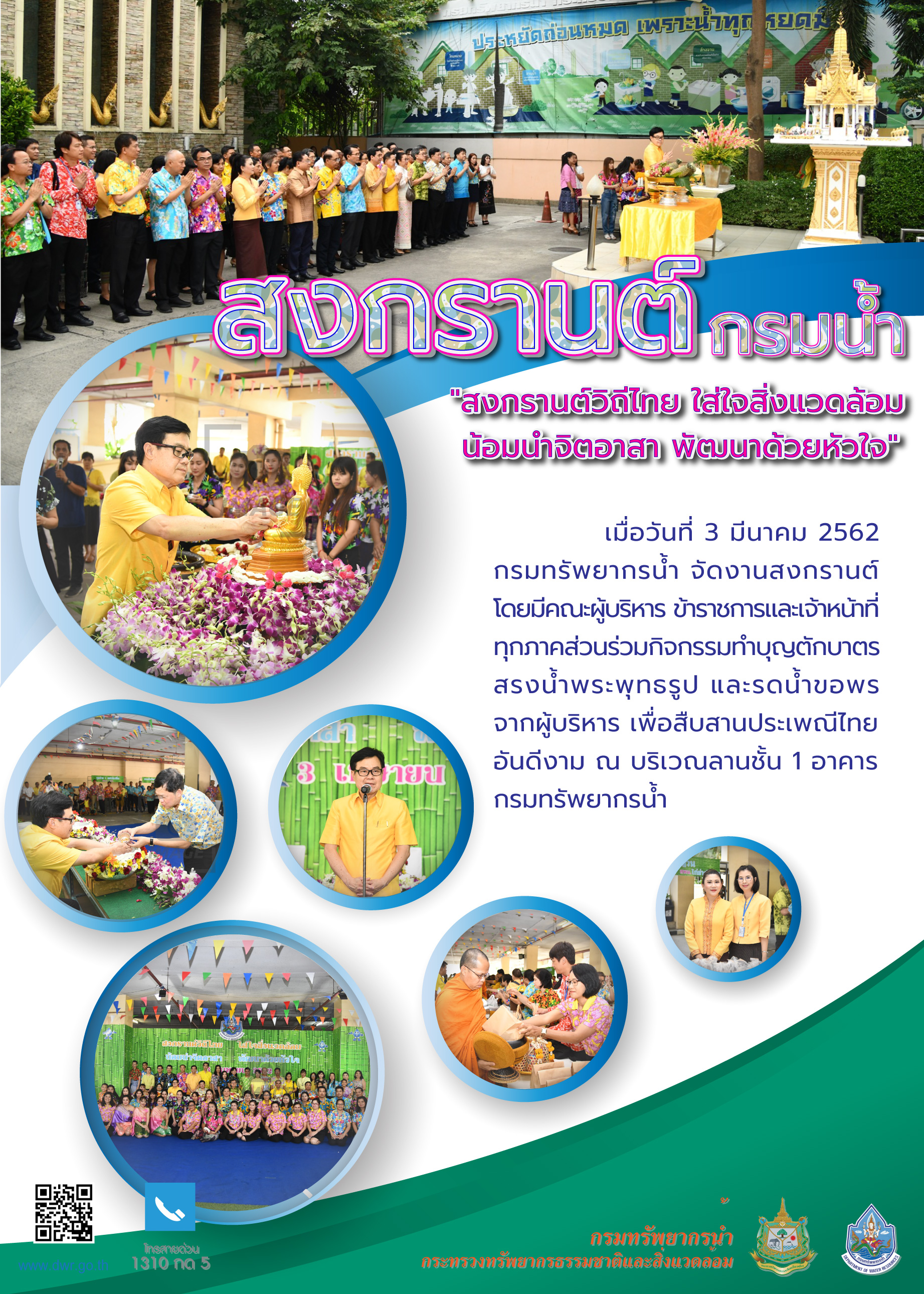 วันที่ 3 มีนาคม 2562 กรมทรัพยากรน้ำจัดงานสงกรานต์ โดยมีคณะผู้บริหาร และเจ้าหน้าที่ทุกภาคส่วนร่วมกิจกรรมทำบุญตักบาตร สรงน้ำพระพุทธรูป และรดน้ำขอพรจากผู้บริหาร เพื่อสืบสานประเพณีไทยอันดีงาม ณ บริเวณลานชั้น 1 อาคารกรมทรัพยากรน้ำ