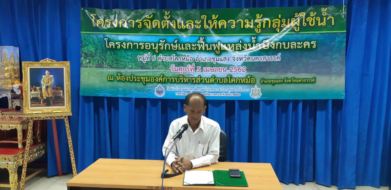 นายพิสิทธิ์ ทิพย์โอสถ ผู้อำนวยการสำนักงานทรัพยากรน้ำภาค 2 มอบหมายให้ส่วนประสานและบริหารจัดการลุ่มน้ำเจ้าพระยา ดำเนินการจัดตั้งและให้ความรู้กลุ่มผู้ใช้น้ำ โครงการอนุรักษ์และฟื้นฟูแหล่งน้ำบึงกบละคร หมู่ที่ 6 ตำบลโคกหม้อ อำเภอชุมแสง จังหวัดนครสวรรค์ โดยมีผู้เข้าร่วมโครงการจำนวน 80 คน