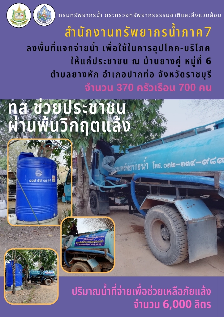 วันที่ 22 เมษายน 2562 กระทรวงทรัพยากรธรรมชาติและสิ่งแวดล้อม กรมทรัพยากรน้ำ โดยสำนักงานทรัพยากรน้ำภาค 7 สนับสนุนรถบรรทุกน้ำขนาด 6,000 ลิตร จำนวน 1 คัน ร่วมกับองค์การบริหารส่วนตำบลยางหัก อำเภอปากท่อ จังหวัดราชบุรี เข้าแจกจ่ายน้ำสะอาดให้กับประชาชนที่ประสบปัญหาการขาดแคลนน้ำอุปโภคบริโภค บ้านยางคู่ หมู่ที่ 6 ตำบลยางหัก อำเภอปากท่อ จังหวัดราชบุรี โดยมีผู้ได้รับประโยชน์ 370 หลังคาเรือน 700 คน ปริมาณน้ำที่แจกจ่าย 6,000 ลิตร