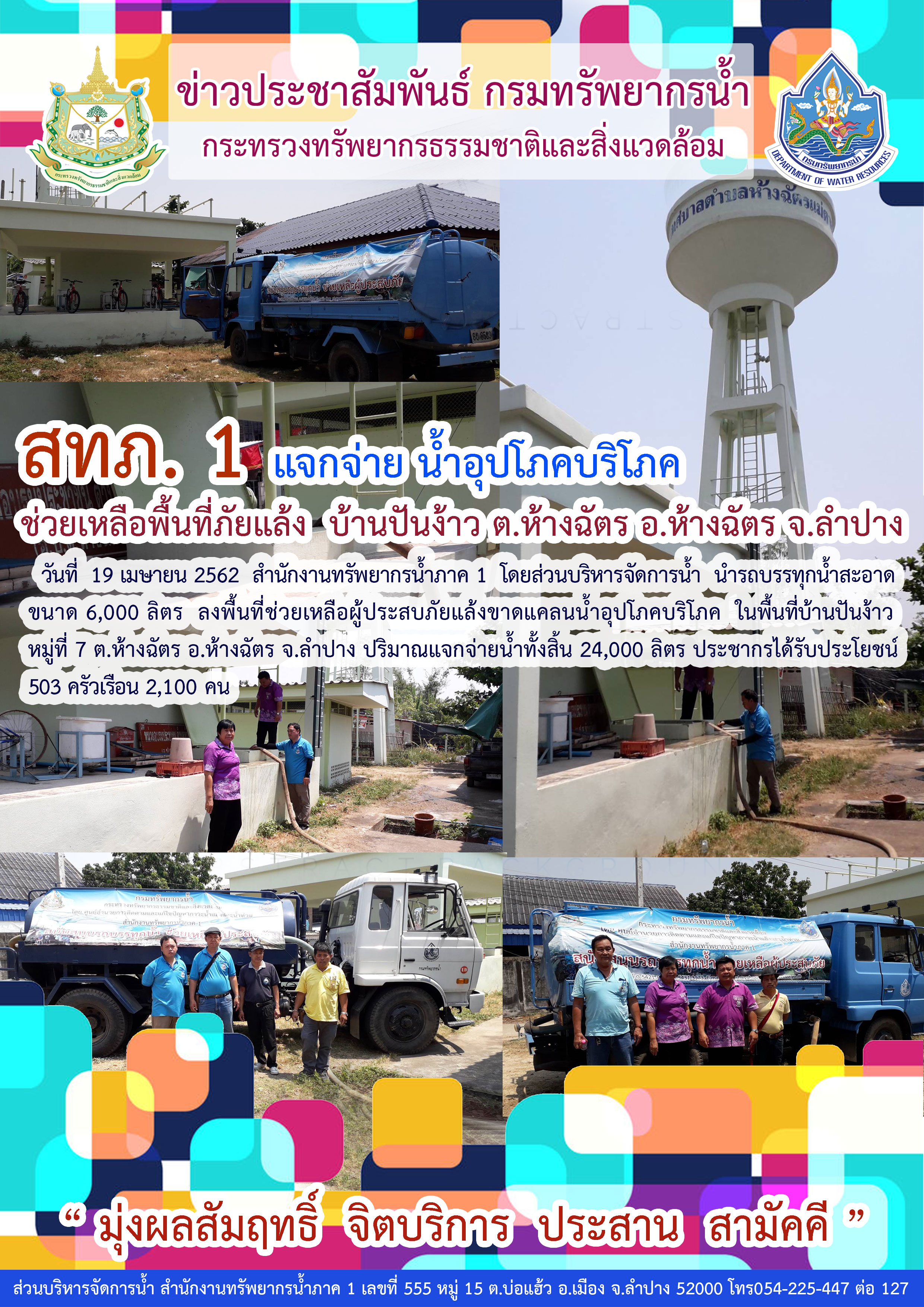 วันที่ 19 เมษายน 2562 สำนักงานทรัพยากรน้ำภาค 1 โดยส่วนบริหารจัดการน้ำ นำรถบรรทุกน้ำสะอาด ขนาด 6,000 ลิตร ลงพื้นที่ช่วยเหลือผู้ประสบภัยแล้งขาดแคลนน้ำอุปโภคบริโภค ในพื้นที่บ้านปันง้าว หมู่ที่ 7 ต.ห้างฉัตร อ.ห้างฉัตร จ.ลำปาง ปริมาณแจกจ่ายน้ำทั้งสิ้น 24,000 ลิตร ประชากรได้รับประโยชน์ 503 ครัวเรือน 2,100 คน