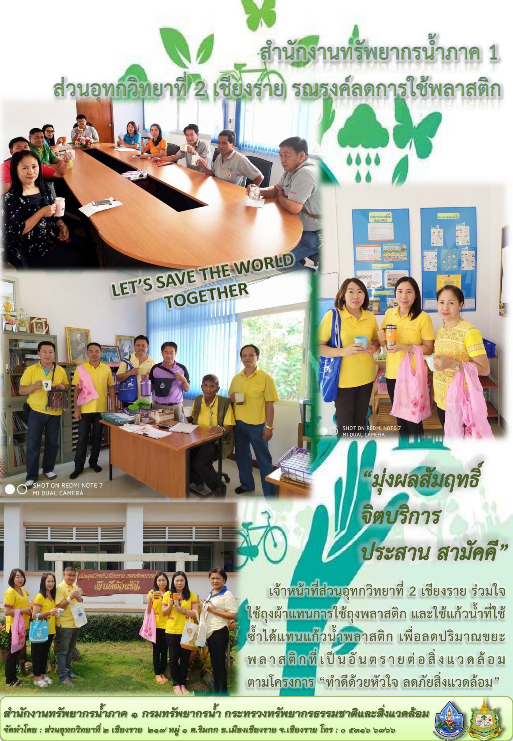 สำนักงานทรัพยากรน้ำภาค 1 โดยเจ้าหน้าที่ส่วนอุทกวิทยาที่ 2 เชียงราย ร่วมใจใช้ถุงผ้าแทนการใช้ถุงพลาสติก และใช้แก้วน้ำที่ใช้ซ้ำได้แทนแก้วน้ำพลาสติก เพื่อลดปริมาณขยะพลาสติกที่เป็นอันตรายต่อสิ่งแวดล้อม ตามโครงการ “ทำดีด้วยหัวใจ ลดภัยสิ่งแวดล้อม”