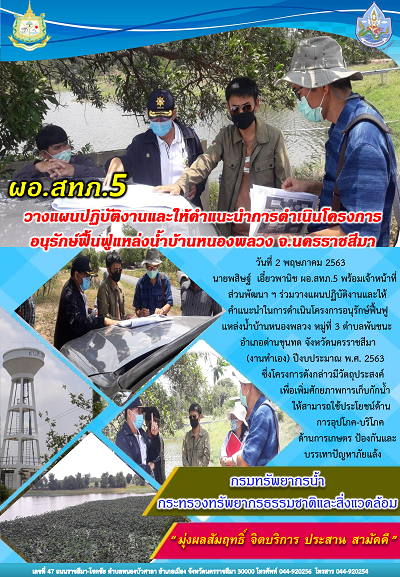 นายพสิษฐ์ เอี๋ยวพานิช ผู้อำนวยการสำนักงานทรัพยากรน้ำภาค 5 พร้อมเจ้าหน้าที่ส่วนพัฒนาและฟื้นฟูแหล่งน้ำ ร่วมวางแผนปฎิบัติงานและให้คำแนะนำในการดำเนินโครงการอนุรักษ์ฟื้นฟูหนองพลวง หมู่ที่ 3 ต.พันชนะ อ.ด่านขุนทด จ.นครราชสีมา (งานทำเอง) ปีงบประมาณ พ.ศ.2563 ซึ่งโครงการดังกล่าวมีวัตถุประสงค์เพื่อเพิ่มศักยภาพการกักเก็บน้ำให้สามารถใช้ประโยชน์ด้านการอุปโภค บริโภค ด้านการเกษตร ป้้องกันและบรรเทาปัญหาภัยแล้ง
