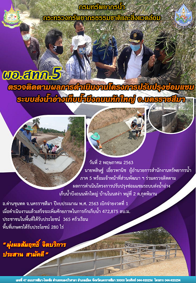 นายพสิษฐ์ เอี๋ยวพานิช ผู้อำนวยการสำนักงานทรัพยากรน้ำภาค 5 พร้อมเจ้าหน้ามี่ส่วนพัฒนาและฟื้นฟูแหล่งน้ำ ร่วมตรวตติดตามผลการดำเนินโครงการปรับปรุงซ่อมแซมระบบส่งน้ำอ่างเก็บน้ำบึงถนนหักใหญ่ บ้านโนนสง่า หมู่ที่ 2 ต.กุดพิมาน อ.ด่านขุนทด จ.นครราชสีมา ปีงบประมาณ พ.ศ.2563 เบิกจ่ายงวดที่ 1 เมื่อดำเนินงานแล้วเสร็จจะเพิ่มศักยภาพในการกักเก็บน้ำ 472,875 ลบ.ม. ประชาชนในพื้นที่ได้รับประโยชน์ 365 ครัวเรือน พื้นที่เกษตรได้รับประโยชน์ 280 ไร่