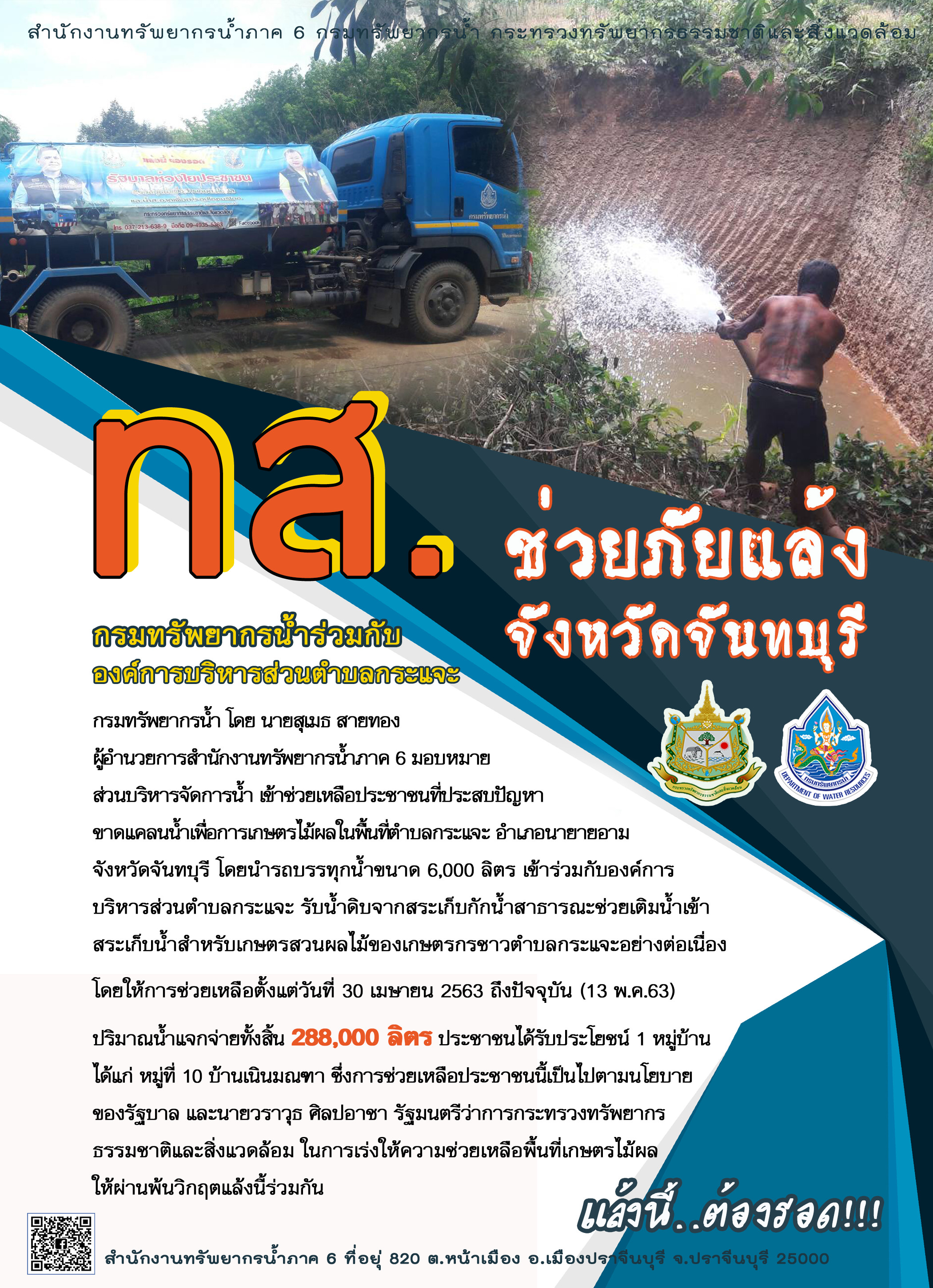 กรมทรัพยากรน้ำ โดย นายสุเมธ สายทอง ผู้อำนวยการสำนักงานทรัพยากรน้ำภาค 6 มอบหมายส่วนบริหารจัดการน้ำ เข้าช่วยเหลือประชาชนที่ประสบปัญหาขาดแคลนน้ำเพื่อการเกษตรไม้ผลในพื้นที่ตำบลกระแจะ อำเภอนายายอาม จังหวัดจันทบุรี โดยนำรถบรรทุกน้ำขนาด 6,000 ลิตร เข้าร่วมกับองค์การบริหารส่วนตำบลกระแจะ รับน้ำดิบจากสระเก็บกักน้ำสาธารณะช่วยเติมน้ำเข้าสระเก็บน้ำสำหรับเกษตรไม้ผลของเกษตรกรชาวตำบลกระแจะอย่างต่อเนื่อง